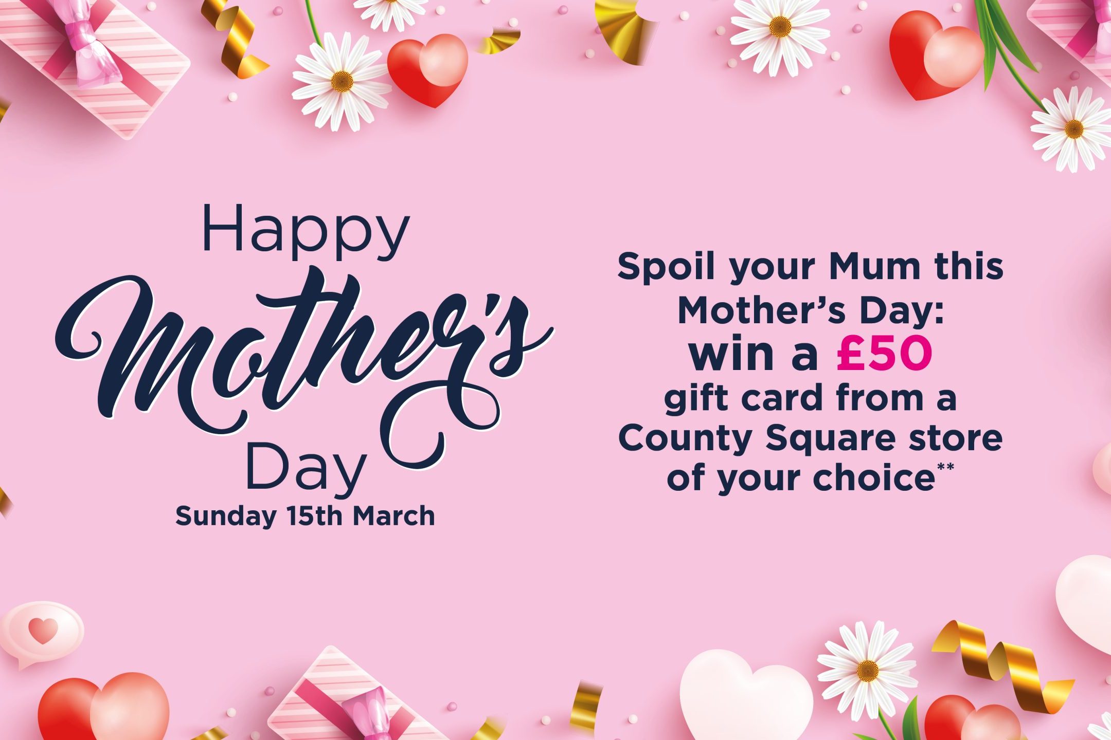 Spoil your Mum this Mother’s Day with a chance to win a £50 gift card from a County Square store of your choice. All you have to do is write a message to your Mum on the leaflets inside County Square and post it in our Mothers Day tombola to be in with a chance to win.